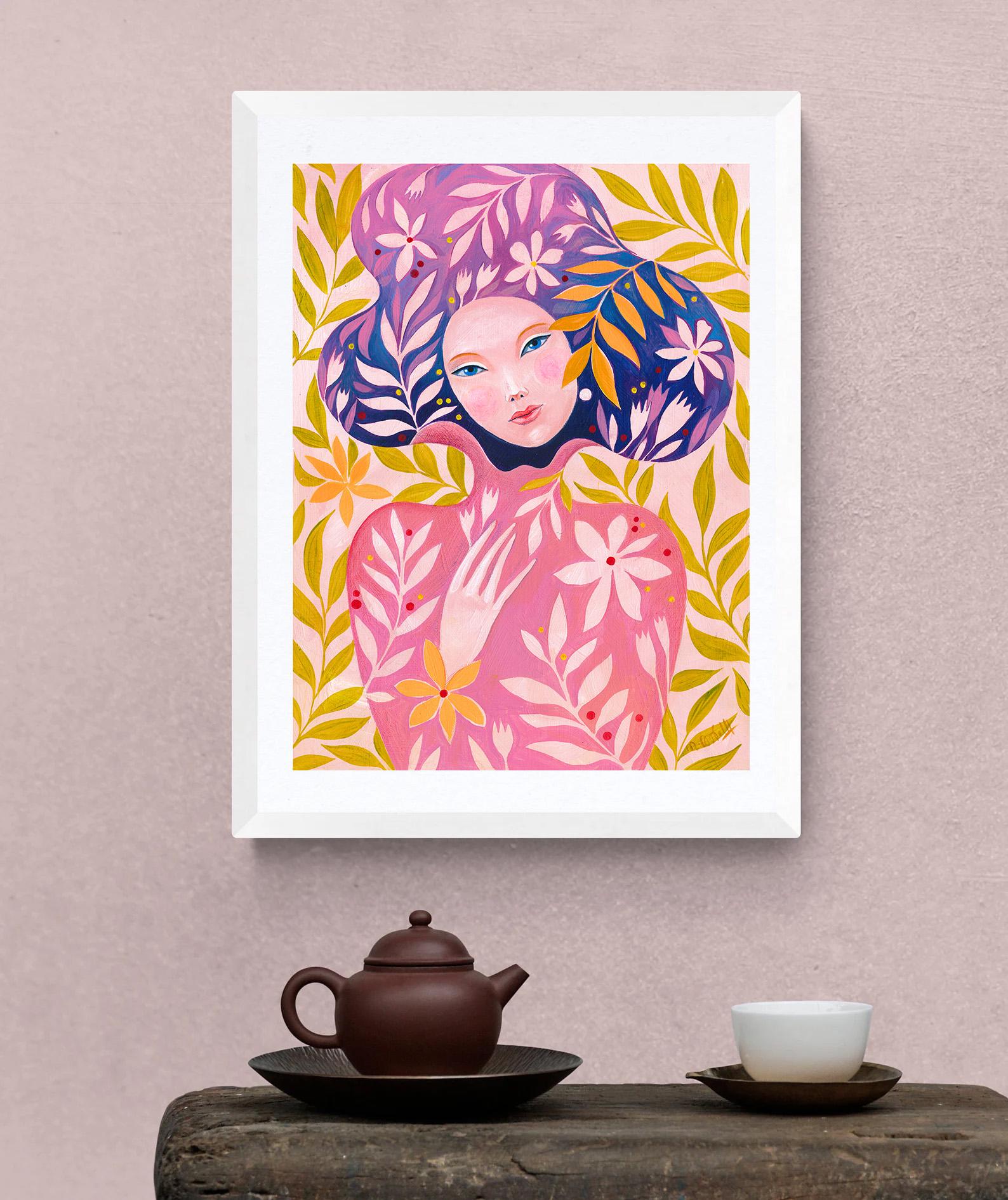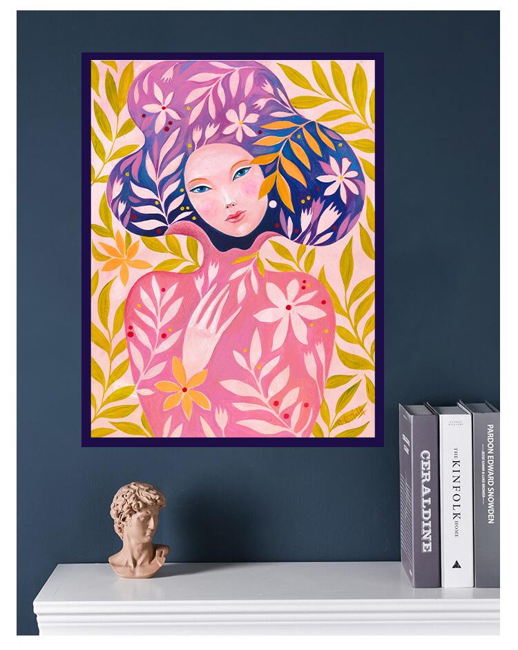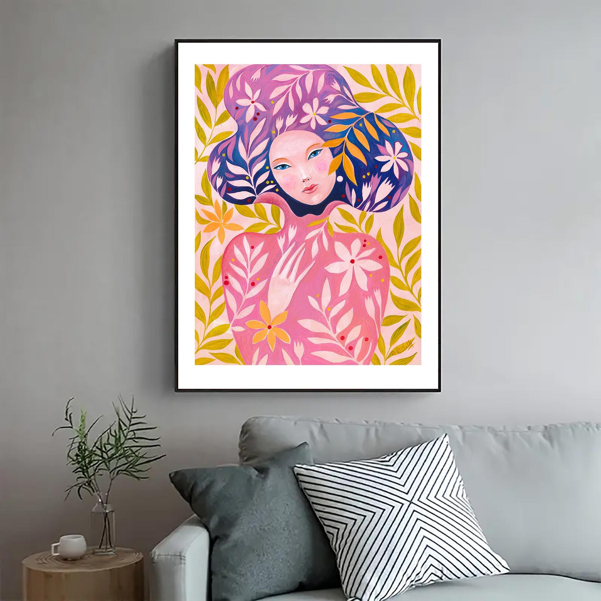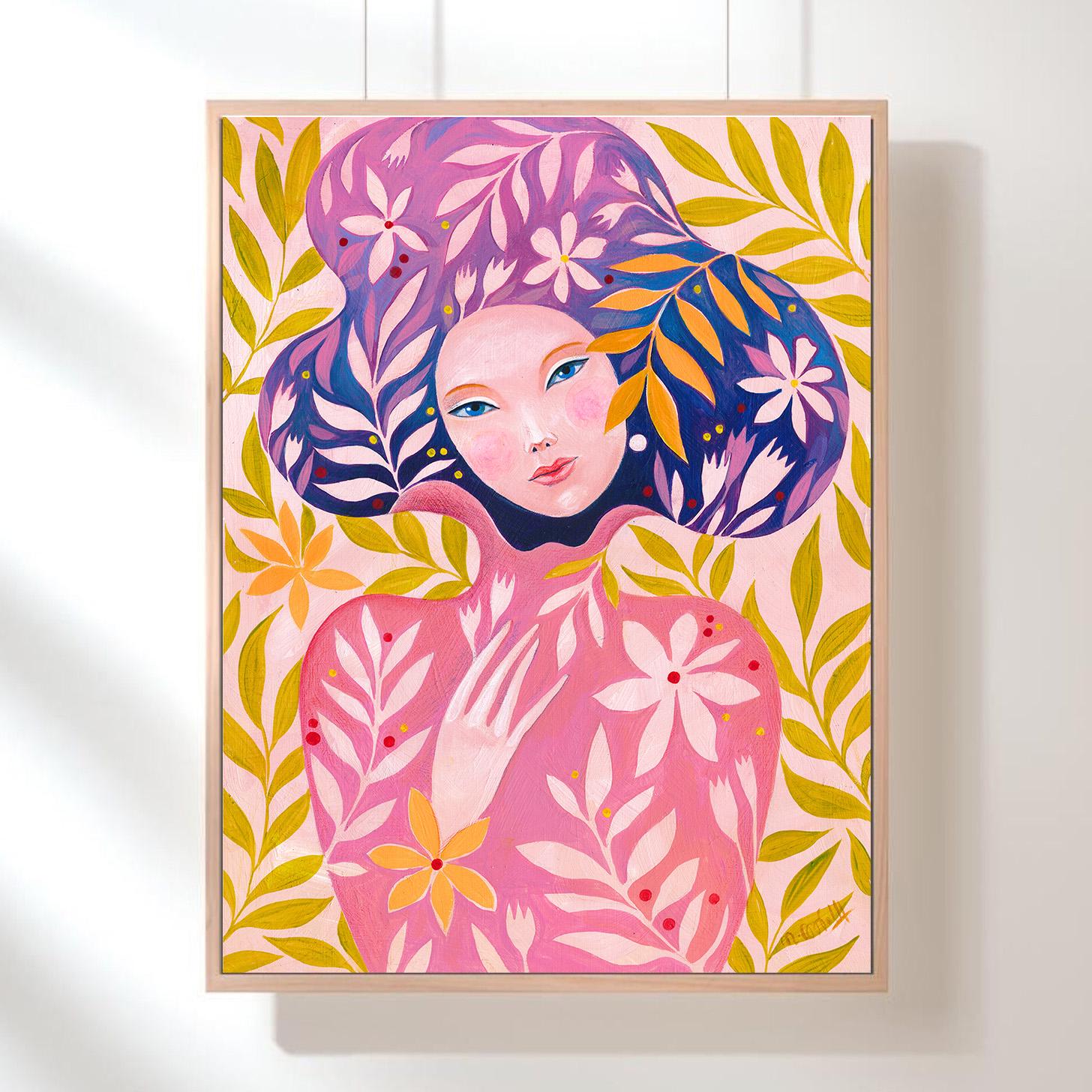 The serene, elegant figure blends with blossoms and leaves to create a harmonious composition that instantly commands attention. This artwork is perfect as a centerpiece in a living room, studio, or creative space and will appeal to collectors who appreciate richly colored, botanically inspired art.