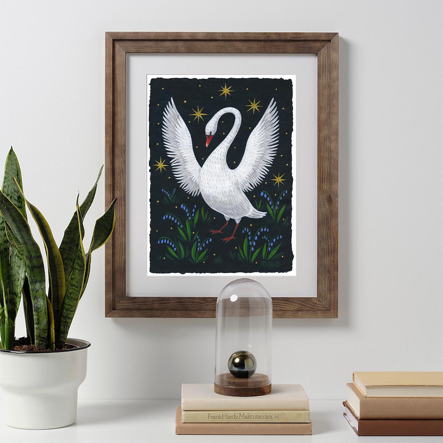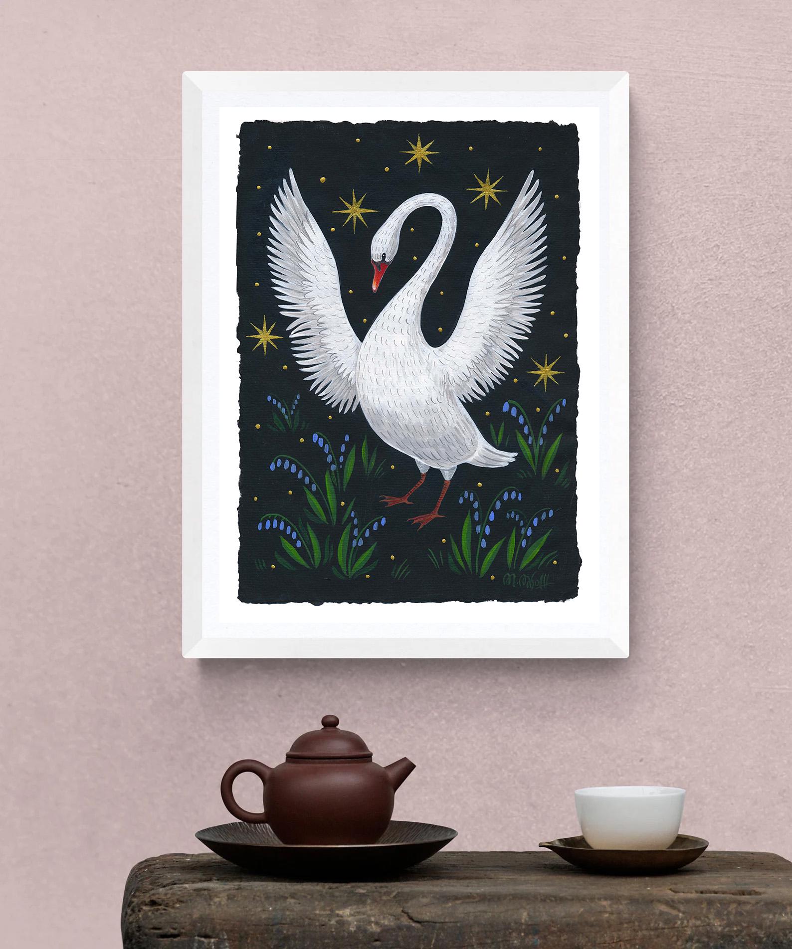 This lovingly hand-painted artwork depicts an elegant white swan surrounded by delicate wildflowers against a black background. Painted on hand-felted paper, the illustration evokes traditional folk art with a modern, poetic touch. Every brushstroke has been meticulously executed on high-quality, textured artist paper.