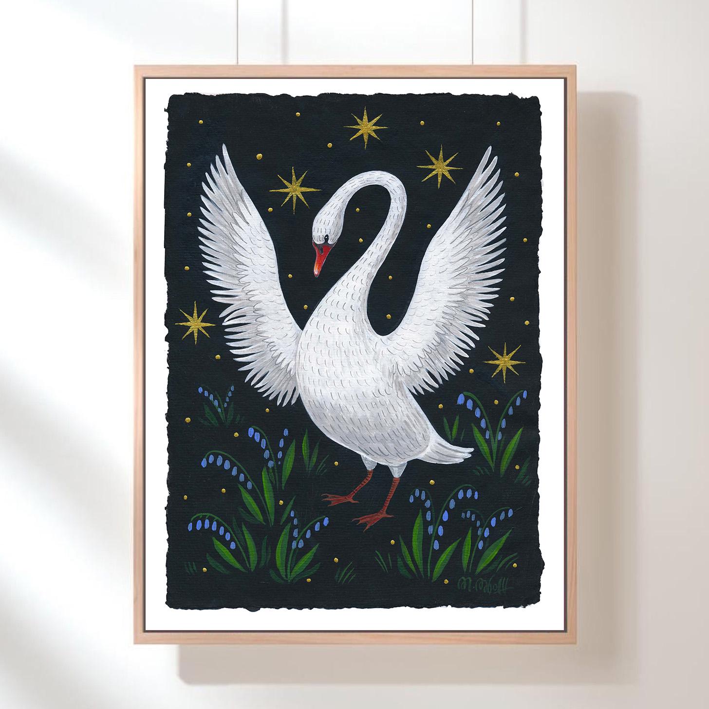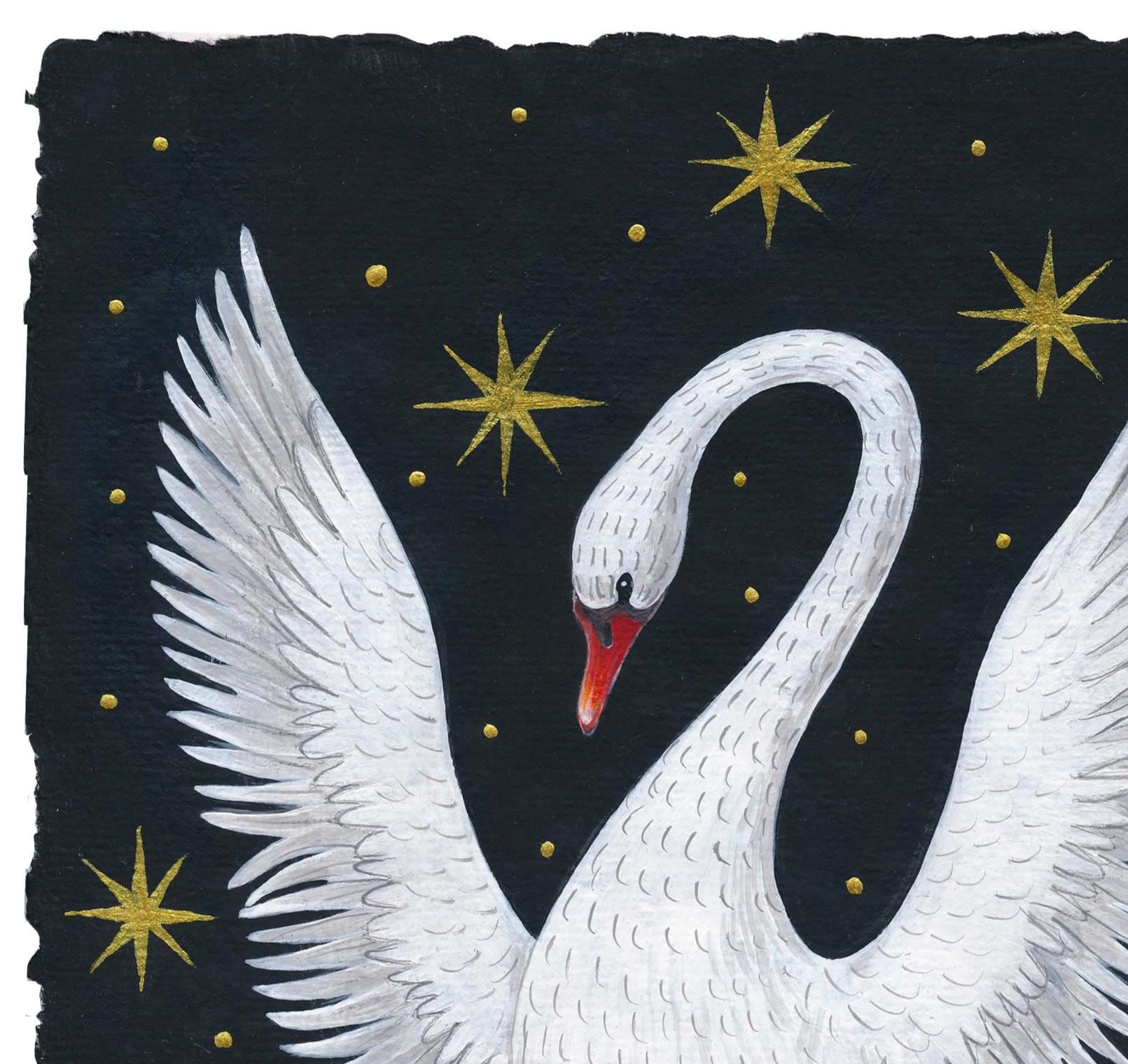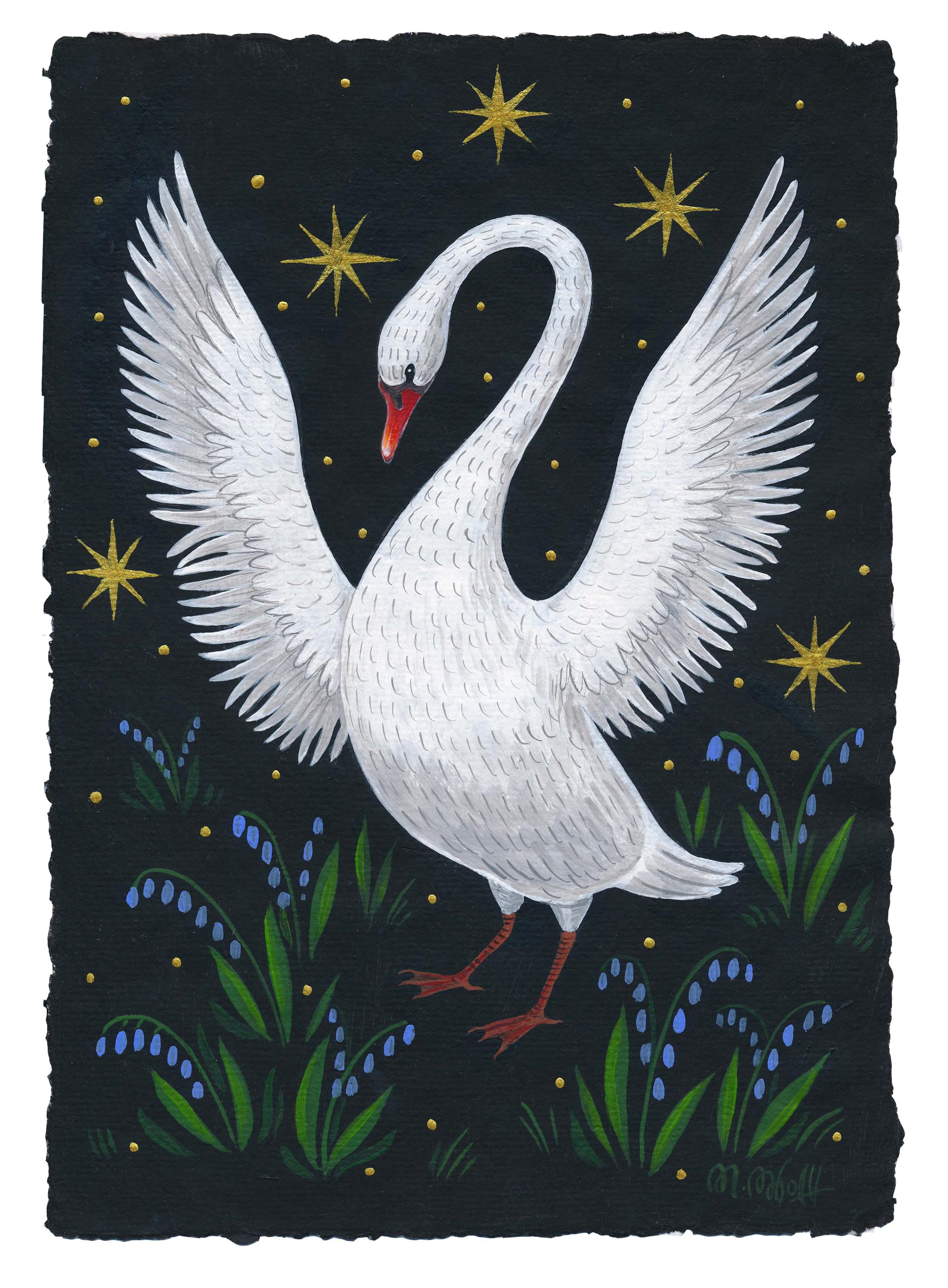 Hand-painted Swan on Artist Paper – Folk Art Illustration with Floral Details