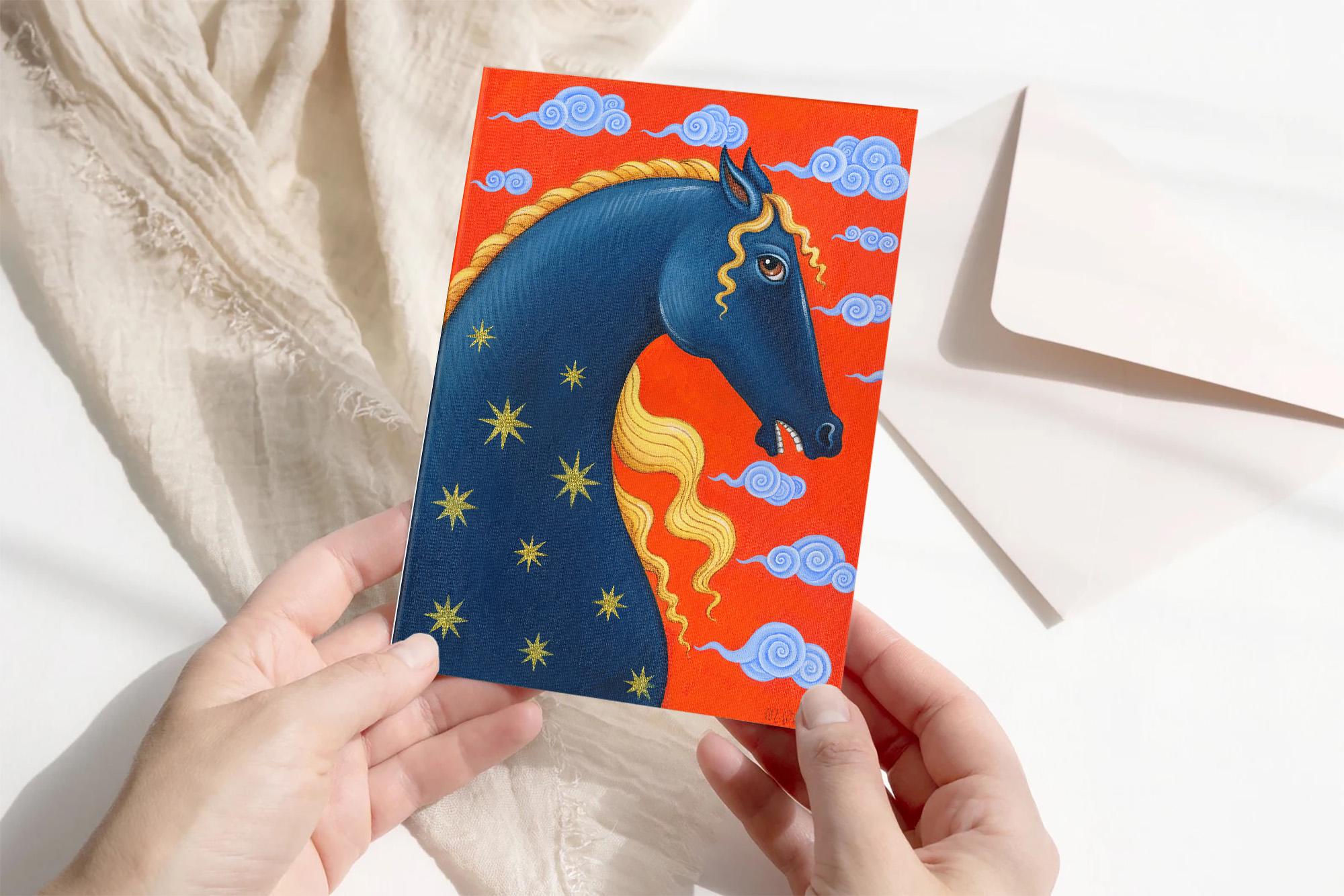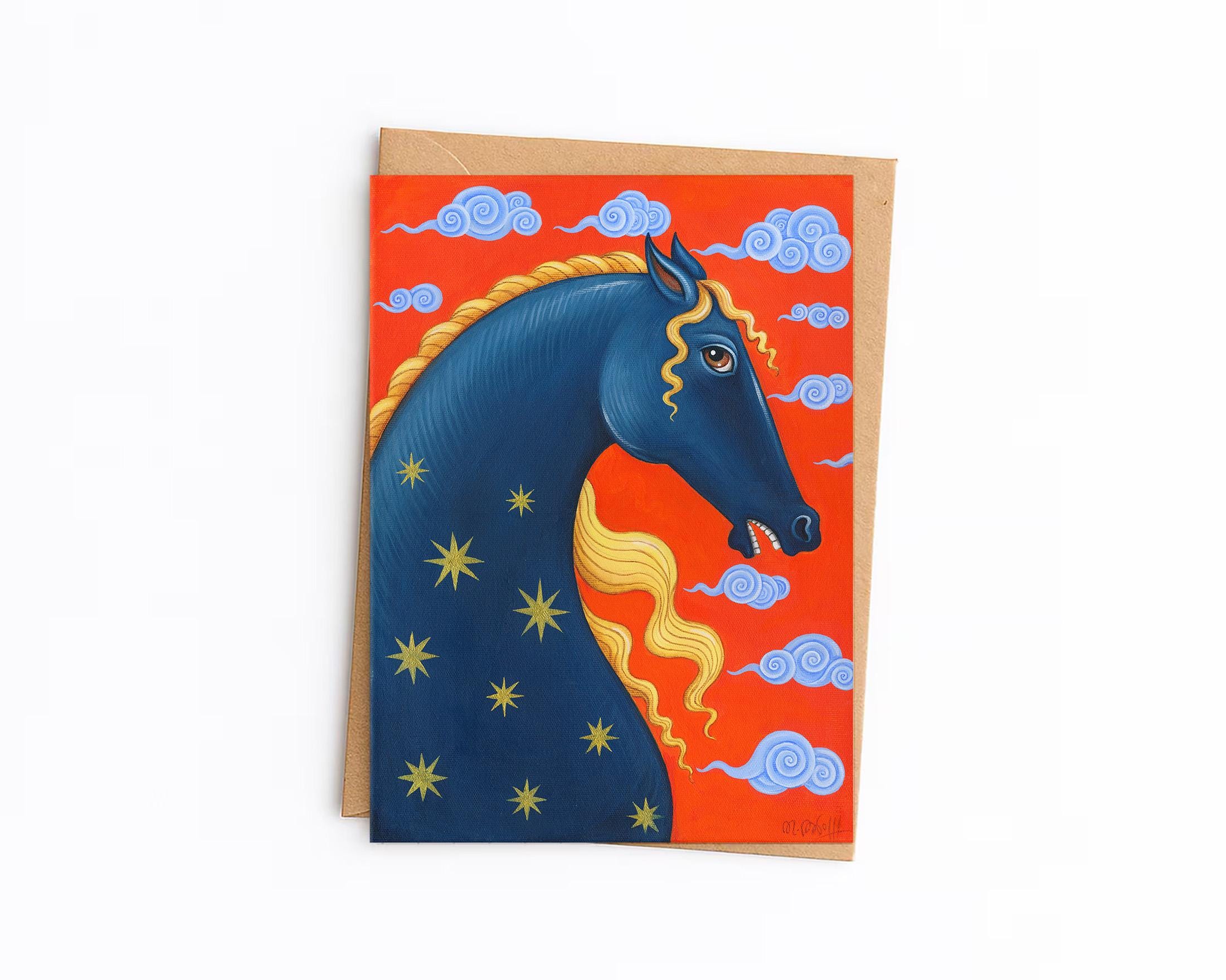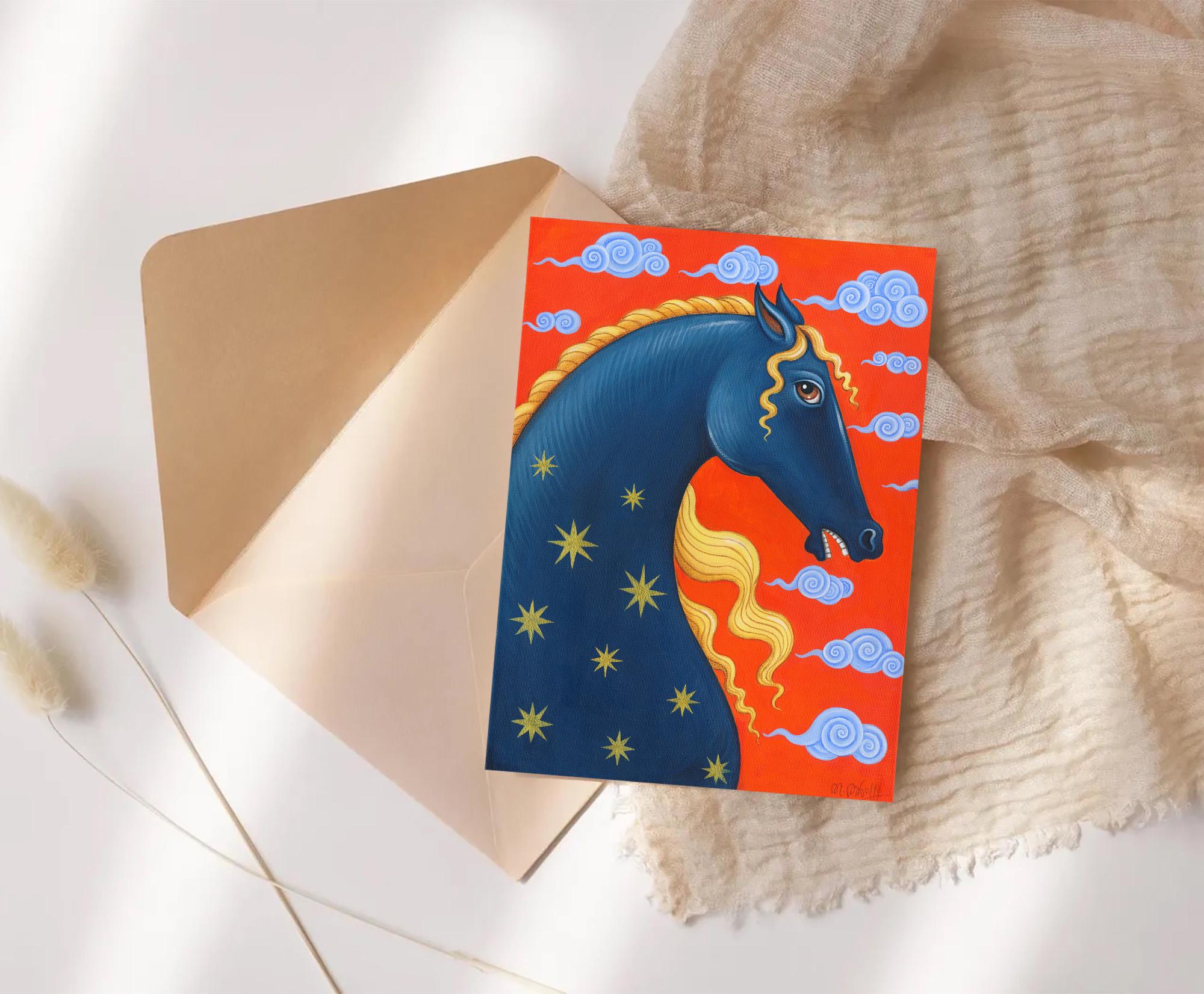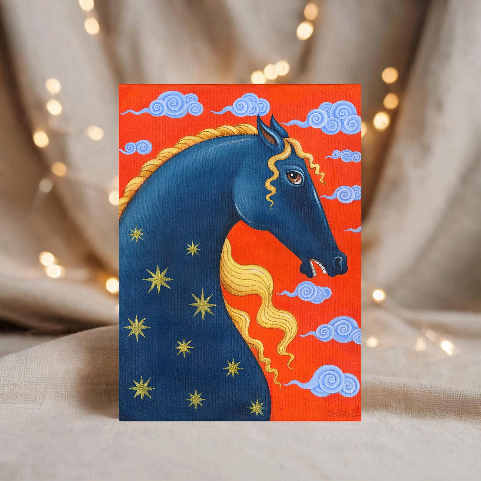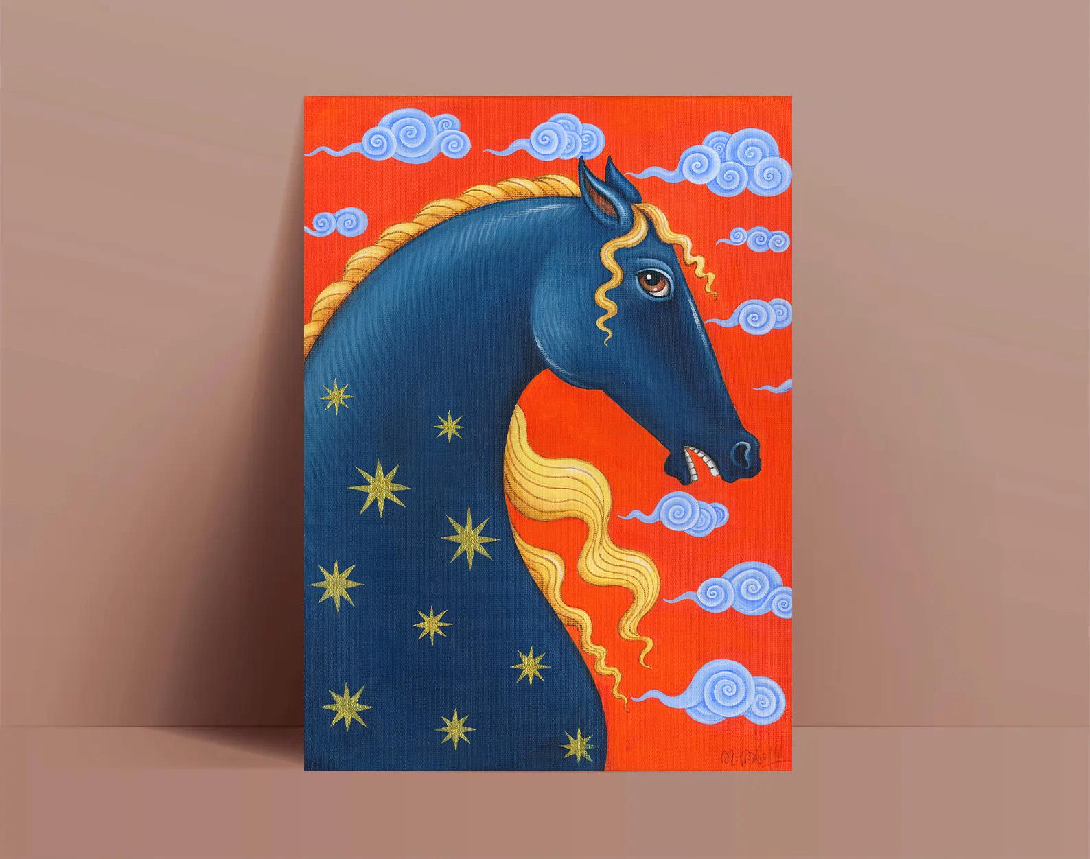 This expressive artwork features a powerful horse portrait set against a vibrant background with decorative clouds and golden stars. The bold colors and clean lines give the piece a strong and symbolic presence.